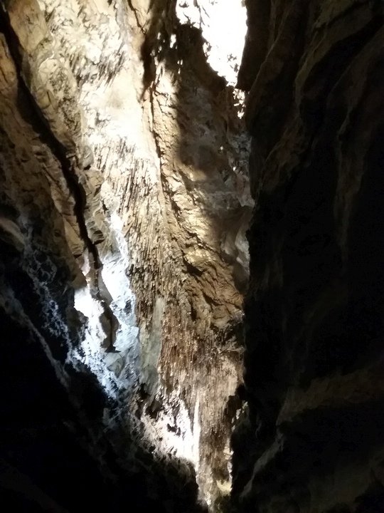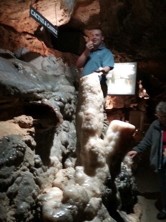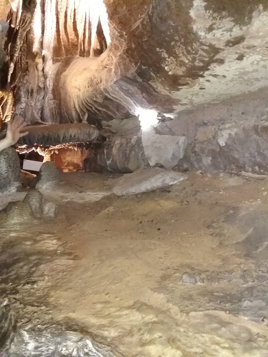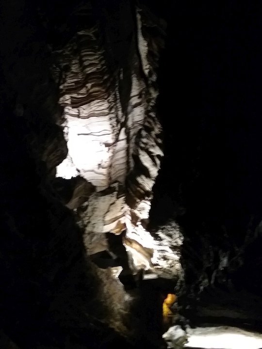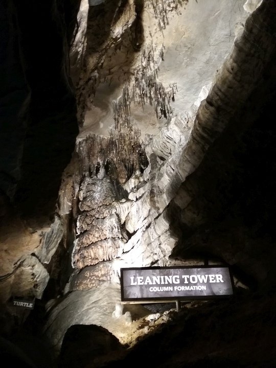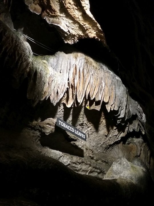 Ruby Falls Cave features many of the more well-known types of cave formations (or speleothems) including stalactites and stalagmites, columns, drapery, and flowstone.[7] The limestone in which the cave is formed is still relatively horizontal, just as it was deposited below sea level.