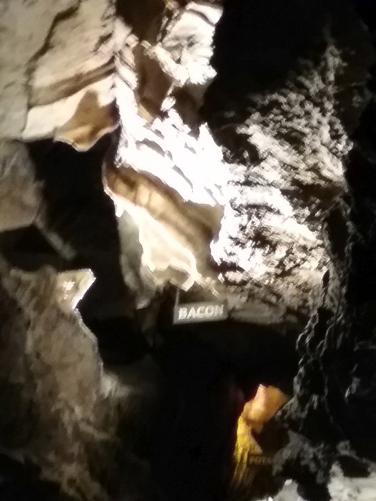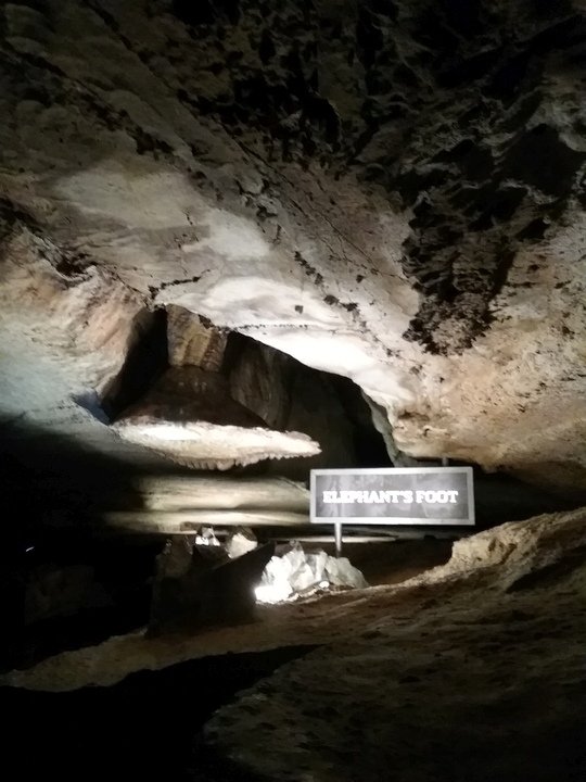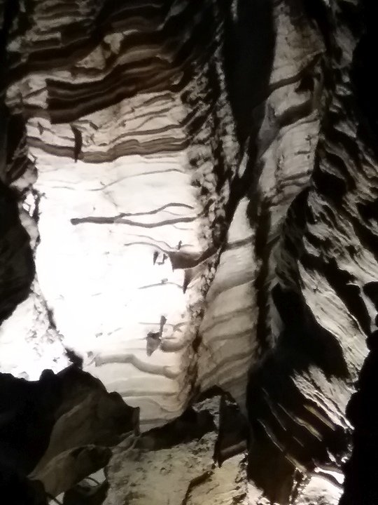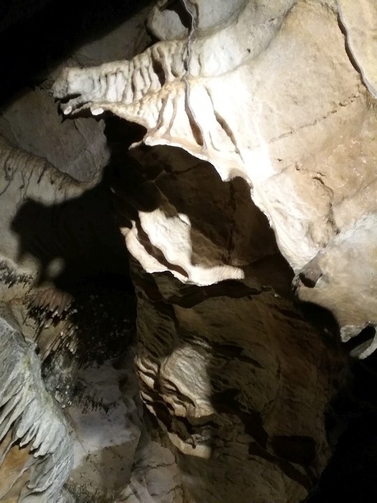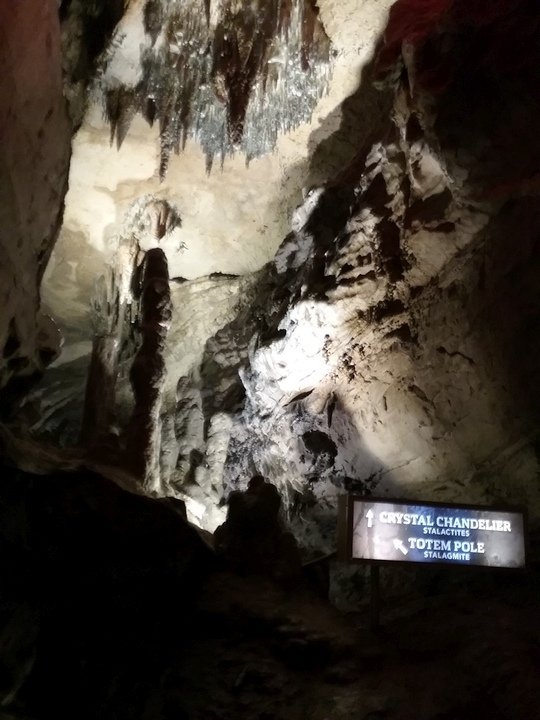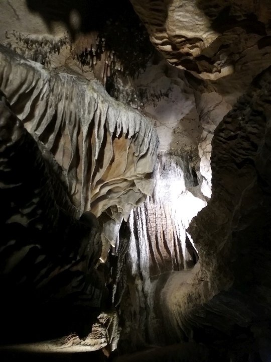 Ruby Falls Cave features many of the more well-known types of cave formations (or speleothems) including stalactites and stalagmites, columns, drapery, and flowstone.[7] The limestone in which the cave is formed is still relatively horizontal, just as it was deposited below sea level.